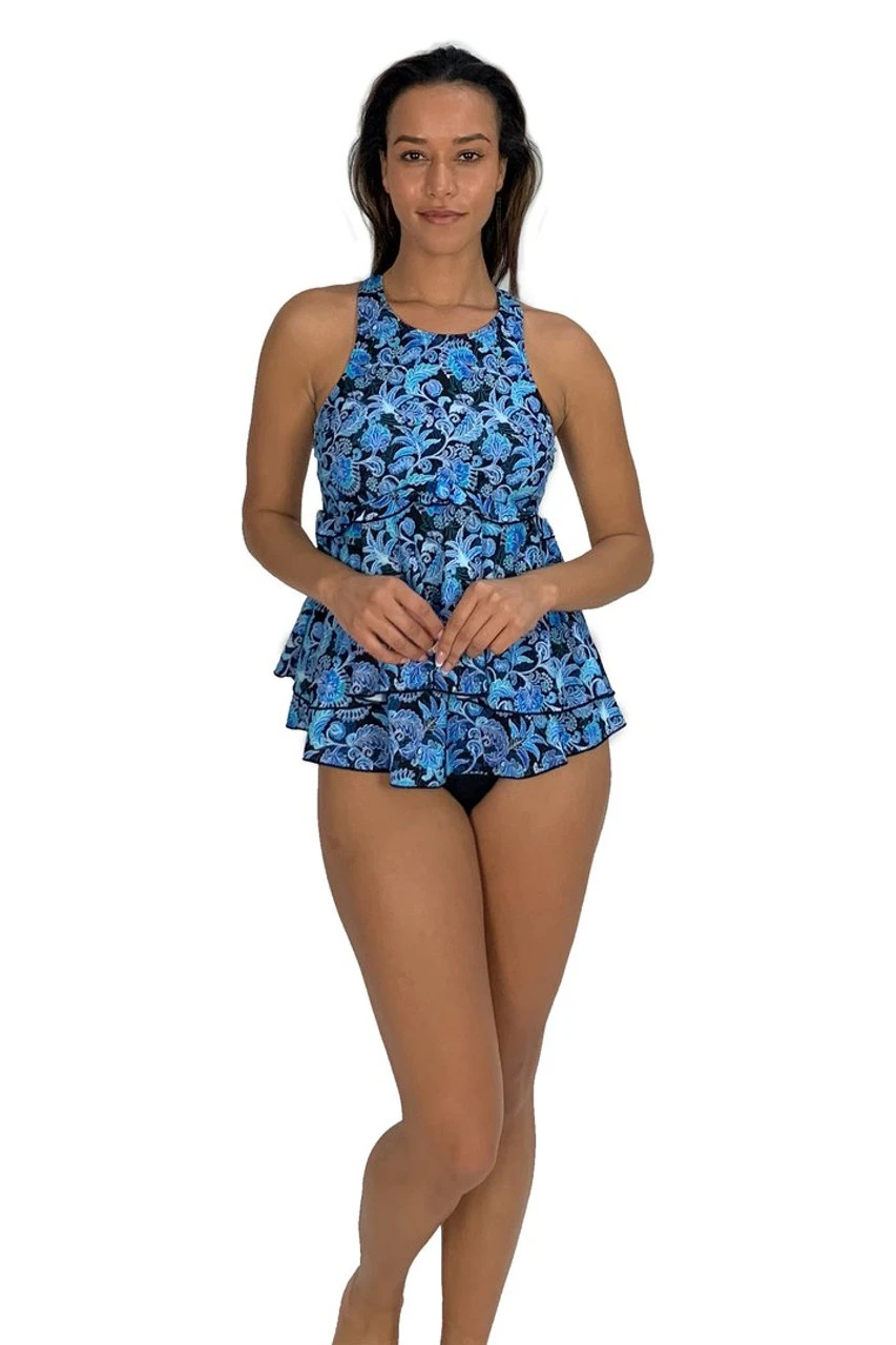 This stunning contemporary style features beautiful fabric in a baby doll shape. The hi neck and 2 tiers provide a fashionable way to camouflage bumps and bulges. -An H-back lift and supports -Soft Cups.