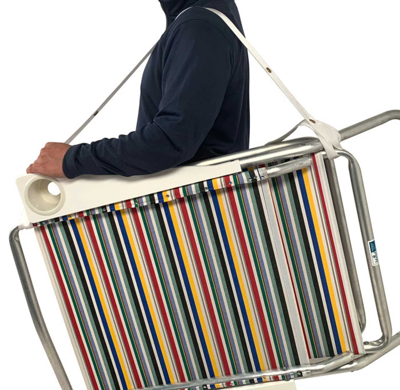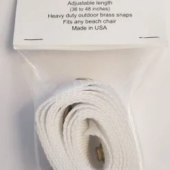 Universal strap designed to fit almost any beach chair, with its adjustable length anyone can use Fits almost any chair – can even add an umbrella Durable brass snaps – doesn't rust, doesn't accumulate sand (like velcro) and doesn't break (like plastic clips). Comes in White Made in the USA *Chair not included*