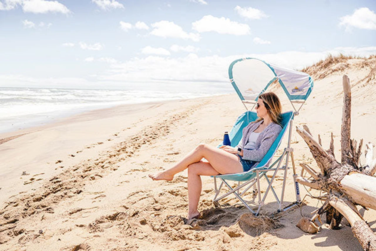 A rocking beach chair with canopy—in other words, your own personal oasis! An adjustable UPF 50 shade protects you from the sun, while the sling-style seat cradles you in comfort. Beverage holder and sleek side pocket for your phone. Contour of the fabric subtly creates a place to rest your arms Folds up compactly, fitting into the Large Mouth Carry Bag. Full-size rocker folds compact Spring Action Rocking Technology Structured sling-style seat for all-day comfort Contoured fabric creates subtle armrests Large Mouth Carry Bag Phone/media holder /li> Beverage holder Breathable mesh panels Powder-coated steel frame. UPF 50 Shade Canopy