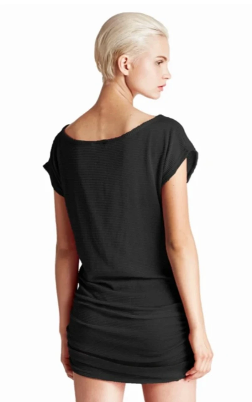 The Gofret pull over boatneck dress with side shirring flirty details with full coverage is a beach lovers dream cover up. Made in the USA 94% Nylon 6% Spandex