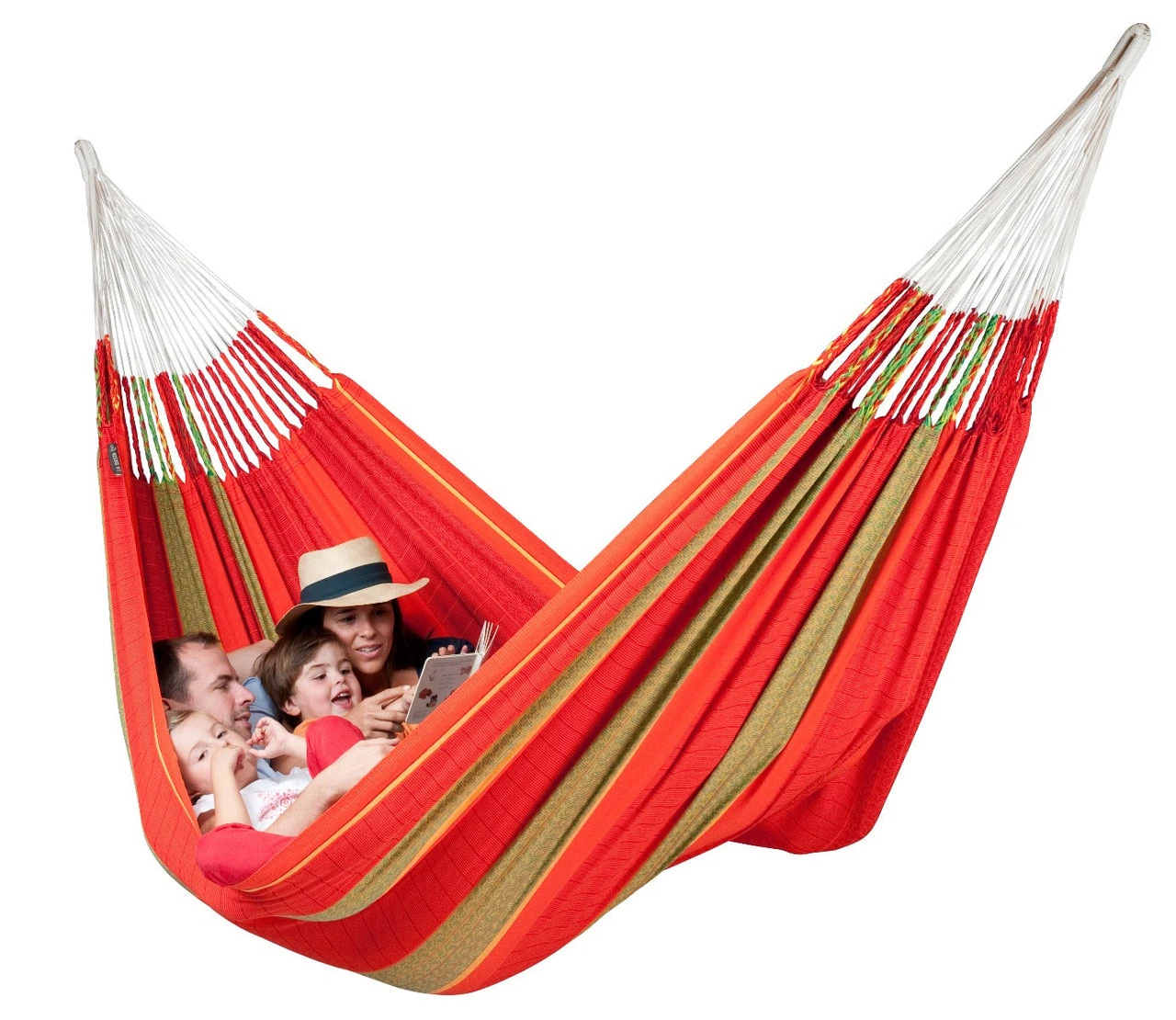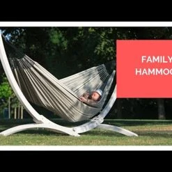 Extra-large family hammockhas a unique weave design and offers unsurpassed comfort. It is extra-large, and its organic cotton is wonderfully soft to the touch. The traditional hand-plaiting of the cords is one of its special quality features. The large number of suspension cords ensures optimal weight distribution, incredible comfort, as well as durability. Reinforced edges make the material extremely tear-resistant. -Family hammock for whole families – 440 lb weight capacity -Bed width: 180 cm (5 ft 11 in); Cloth length: 260 cm (8 ft 6 in); Total length: 400 cm (13 ft 1 in); Required minimum distance: 360 cm (11 ft 10 in) -Family hammock for whole families – 440 lb weight capacity -Bed width: 180 cm (5 ft 11 in); Cloth length: 260 cm (8 ft 6 in); Total length: 400 cm (13 ft 1 in); Required minimum distance: 360 cm (11 ft 10 in) -Traditionally handmade in Colombia with hand-braided plaits, tear-proof selvage and many suspension cords