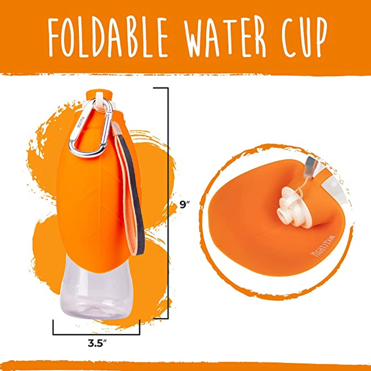 Mighty Paw"™s modern and stylish Travel Dog Water Bottle is made with BPA-free, food-grade silicone that"™s free from harmful chemicals. That makes it perfectly safe for your pup to drink from it! Our reusable travel dog water bottle holds 20 oz of water (590 ml). That makes it perfect for even the thirstiest of pups, small or large! 100% BPA-free, food-grade silicone leaf & bottle Safe to drink while hiking and walking Reusable water bottle Gentle on the environment Leak-proof silicone nozzle cover Prevents messes Soft wrist strap Carry the bottle yourself Durable carabiner clip Clip it to your pup"™s harness or to your backpack Top-rack dishwasher safe Easy to clean Available in 2 bright colors: Orange and Green Holds 20 oz of water Great size for small, medium and large pups