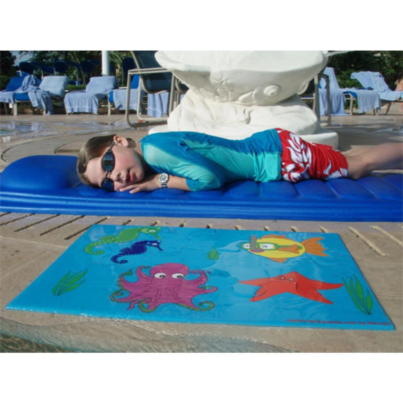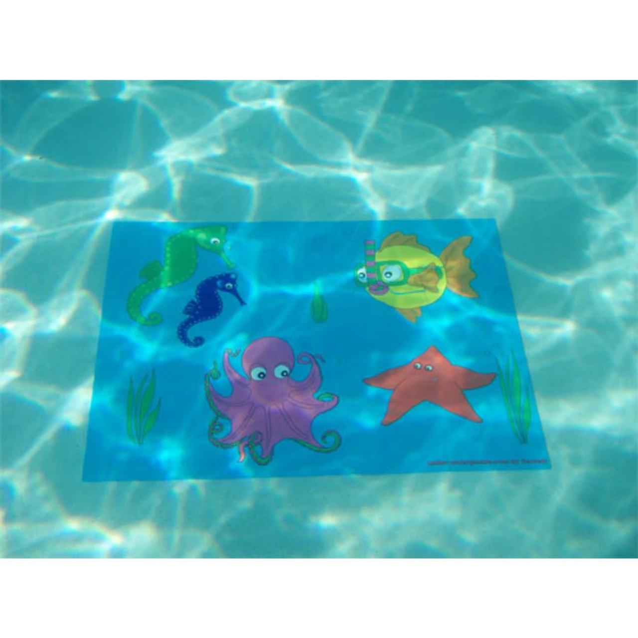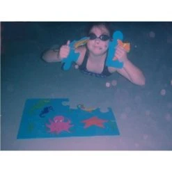 Take your puzzle on the go to the beach or pool this summer! This puzzle is created by a special process that allows the pieces to sink in water. Its highly visible colored illustration and large pieces makes it just right for busy young hands. This puzzle can be taken in the bathtub, pool or beach and can be left out in the rain. Puzzle meaures 18" x 24". Comes with mesh backpack carry case.