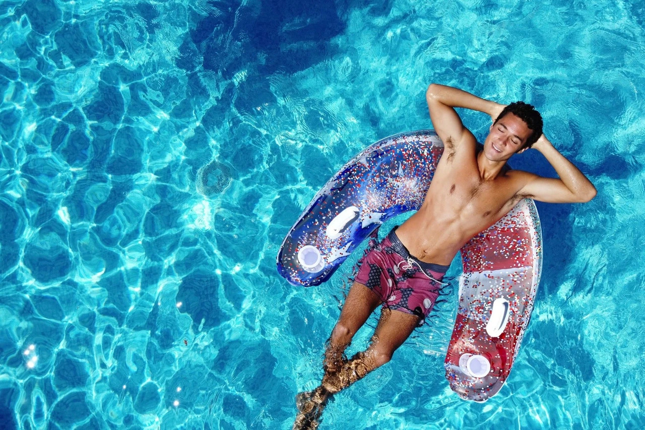 Shine bright in the water with this patriotic sun chair! Features Contains reflective glitter. Made from PVC Designed for both kids and adults Made in the USA.
