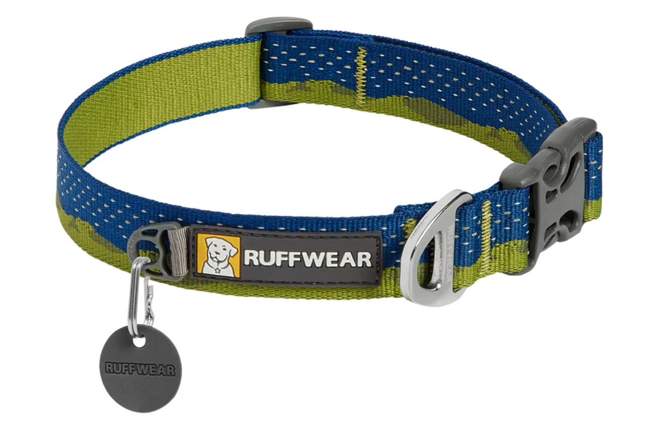 The Crag Collar combines our user-friendly, side-release buckle with our reflective Tubelok webbing, now including patterns inspired by ways natural light interacts with our favorite landscapes. The Crag Collar is packed full of Ruffwear's essential collar features: a separate ID tag attachment point, a silicone tag silencer, strong and comfortable webbing that holds its color, and aluminum V-ring.The Crag Collar is an everyday dog collar with reflective Tubelok webbing and an easy-to-use side-release buckle. Reflective thread is woven into the comfortable and durable webbing, available in solid colors and – for the first time – patterns inspired by ways light naturally occurs in our favorite landscapes.