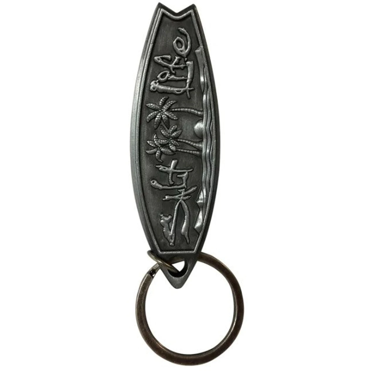 This keychain has antique finish detailing and recessing,a signature logo on the back of the key chain,and you can open a bottle with the fins. 100% metal One size fits most 3” long Bottle opener Care: Hand wash in cold water