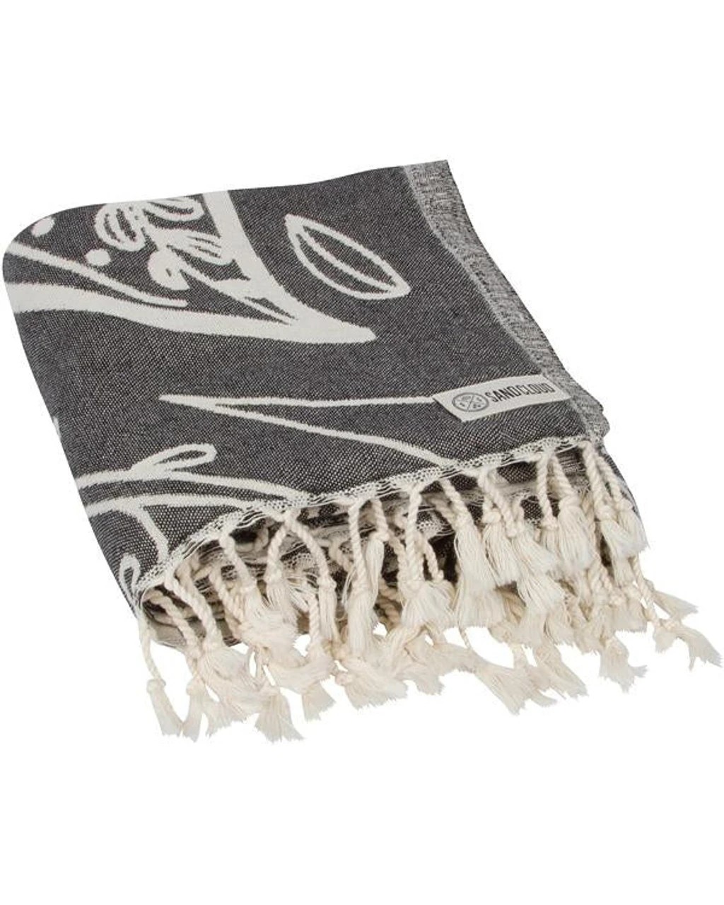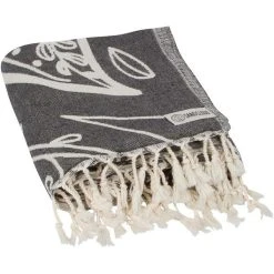 Approx 36" x 68" Color: Black Towel Weight: 360 gsm 100% Turkish Organic Cotton Sand Resistant Design! Made and Loomed in Turkey Single weave jacquard Twisted tassel fringe A portion of the proceeds go towards marine conservation. Care Details Machine wash on delicate or gentle using cold water with like colors. Best practice hang to dry. Tumble dry low also acceptable. Do not use Bleach, Fabric Softners, and Dryer Sheets.