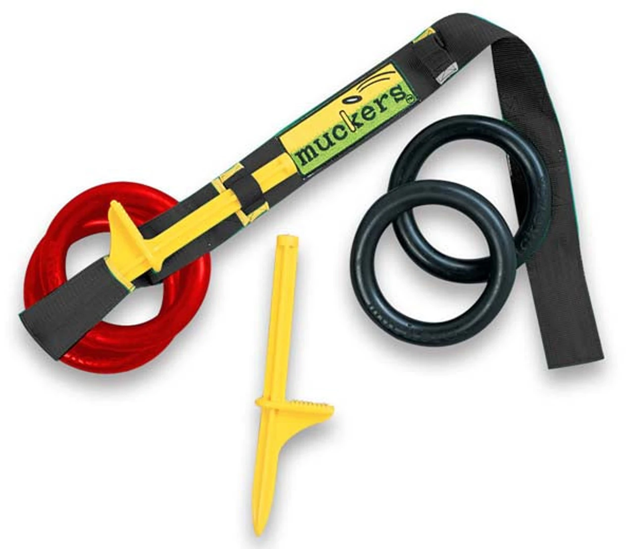 Saturnian Muckers Ring Toss is the game for skill and easy-going competition. Muckers is perfect for parties, cookouts, the beach, and picnics. Easy-to-grip rings are 100% safe natural rubber with no sharp edges. 3' nylon carry strap provides portability and easy storage Directions sewn on strap