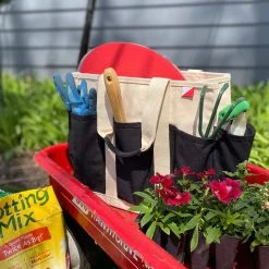 You'll find countless uses for this multiple-pocket work bag from crafting, gardening, school supplies or traveling. Crafted from eco-friendly, heavyweight cotton canvas 8 external gusseted pockets, each 8 1/2" high for loads of organization Cotton webbing handles with colored cotton grip Dimensions: 15" x 13" x 7"/li>