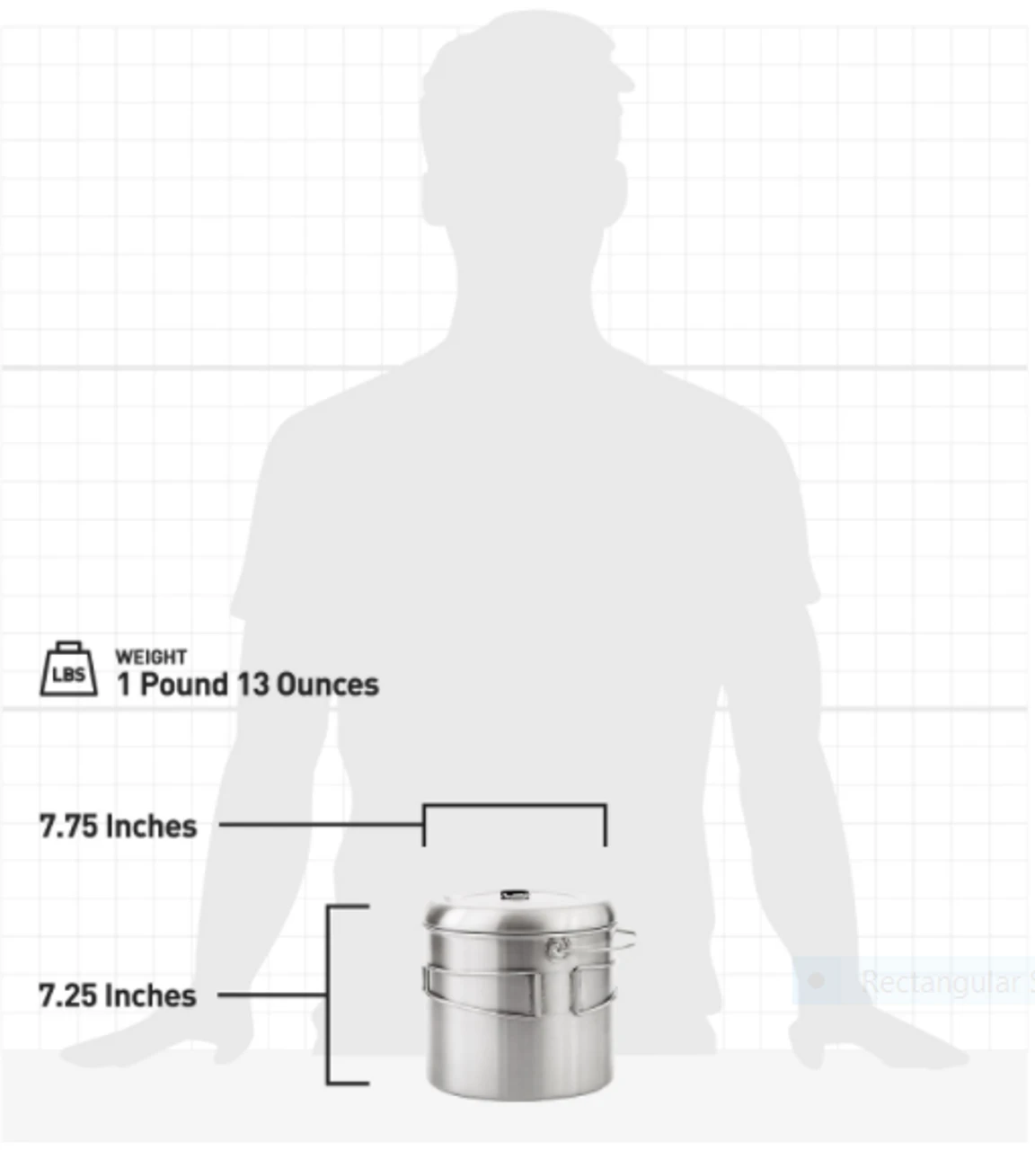 You've found the perfect pot to use with Solo Stove® Campfire! Crafty tasty hot meals instead of settling for granola bars and prepackaged snacks. Solo Stove® Campfire nests right inside Pot 4000 Pot 4000 Features: Made with durable 304 stainless steel Lockable silicone-coated lift tab Bail handle to hang from Tripod Double fold-out handles Volume markings in ounces and milliliters Pot 4000 holds up to 4000 ml. **Solo Stove® Campfire and Tripod sold separately** Materials 304 Stainless Steel VOLUME 135 fl. oz (4000mL) WEIGHT 1 lb 13 oz