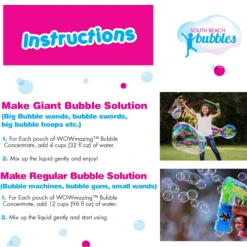 The WOWmazing„ Bubble Concentrate Refill will keep the party going! The WOWmazing Bubble Concentrate was specially formulated for creating giant, high flying and long-lasting bubbles. -Set includes 3 pouches that will make hundreds of WOWmazing bubbles. -Use one pouch at a time. For GIANT bubbles, simply add 1 pouch of WOWmazing Bubble Concentrate to 4 cups of tap water. -For regular size bubbles, add 1 WOWmazing pouch to 12 cups of tap water.-Set includes 3 pouches that will make hundreds of WOWmazing bubbles. -Use one pouch at a time. For GIANT bubbles, simply add 1 pouch of WOWmazing Bubble Concentrate to 4 cups of tap water. -For regular size bubbles, add 1 WOWmazing pouch to 12 cups of tap water.