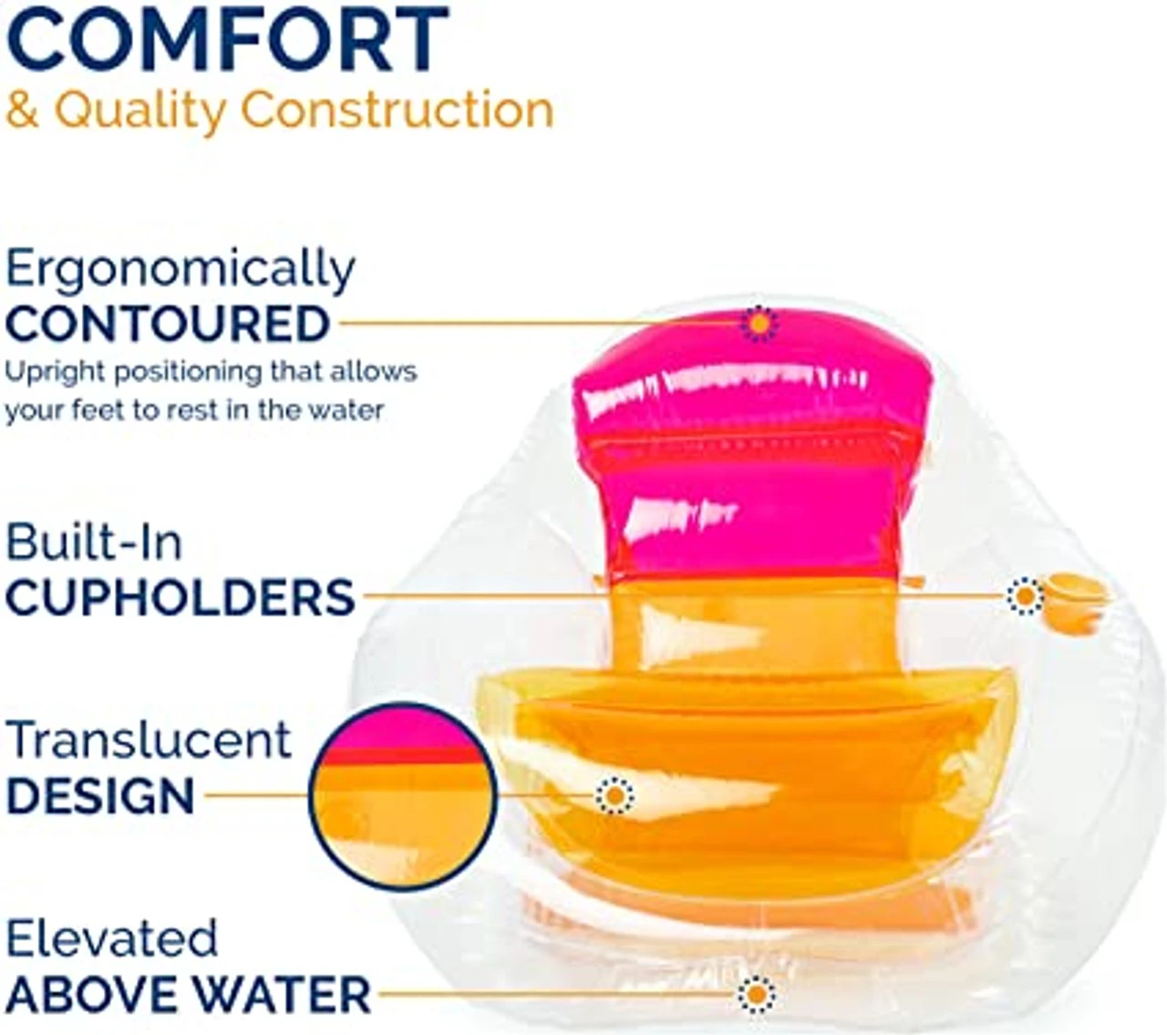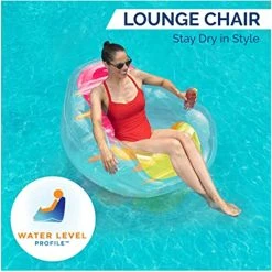 Float in ultimate comfort and style with comfortable upright positioning that allows your feet to rest in the water for complete relaxation or fun with friends in the pool or for lake floating. Hyper-Flate Valve technology maximizes airflow in while preventing airflow out to provide efficient ultimate speed inflation that works 3 times faster Crystal clear PVC base allows you to easily view and enjoy the ambiance of the water Integrated molded cupholder Measures 40" x 41" (102 cm. x 104 cm.) when inflated and supports up to 250 lbs. (113 kgs.)
