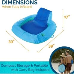 This is a great float for both adults and teens in the pool, lake or bay. Exclusive Hyper-Flate Valve Technology™ Includes reuseable carry-bag Tilt your head back in total comfort with the supporting headrest, padded armrest, and backrest Easily store and transport with folding feature Built in cup holder Fabric-covering and cooling mesh 40" x 40" x 16" Recommended for Ages 15+